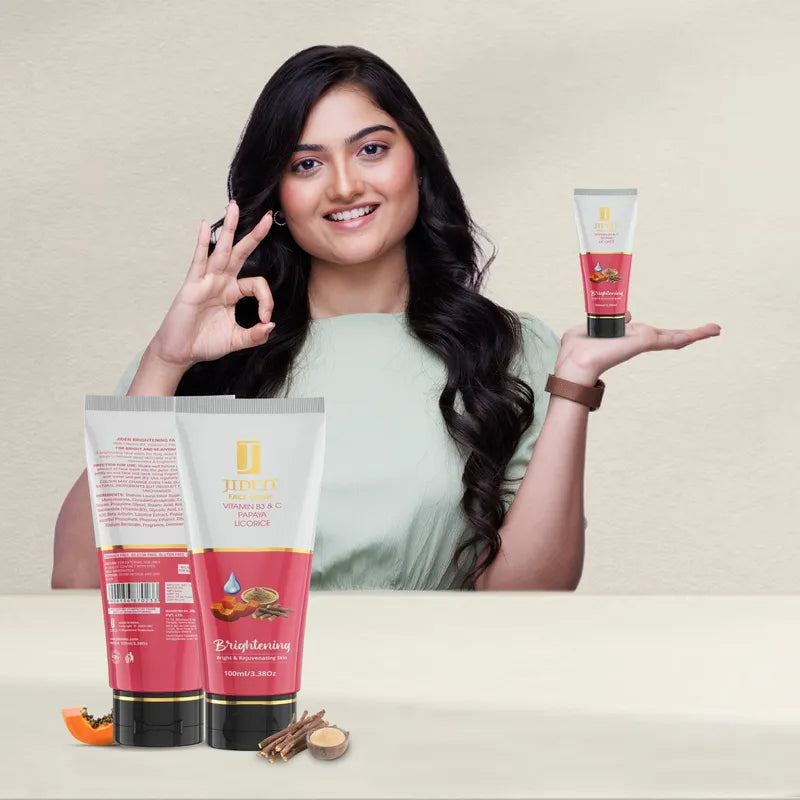 Jiden Brightening Face Wash for glowing skin is perfect for you if you are looking for bright and rejuvenated skin. This face wash allows daily deep facial cleansing which helps to remove dead facial skin cells. Licorice extract brightens the skin by removing the excess melanin and helps to protect the outer layer of the skin, keeping the skin look fresh and lush full. Papaya extract provides the skin with natural moisture which fights skin dryness by hydrating skin thus making it soft and radiant. The combination of Papaya extract and Licorice extract boosts the skin rejuvenation and allows the skin to stay healthy and retain its glow. This gentle face wash is also formulated with Vitamin B3 & C to bring natural glow to the skin and fight free radicals and damage caused by pollution.