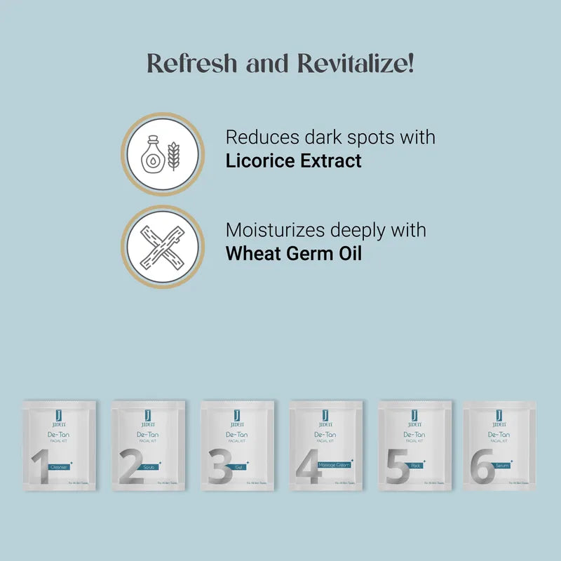 Revitalize your skin with our De-Tan Facial Kit, featuring Wheat Germ Oil and Licorice Extract.