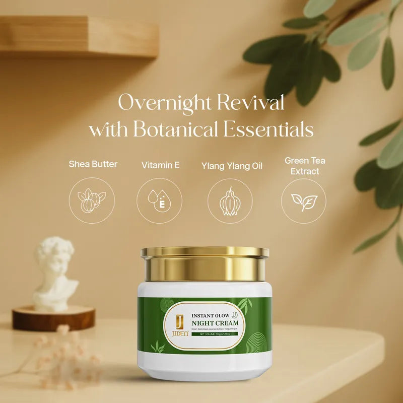 Jiden Instant Glow Night Cream deeply nourishes your skin overnight. Green Tea Extract rejuvenates skin and helps repair cells, maintaining optimal collagen levels.